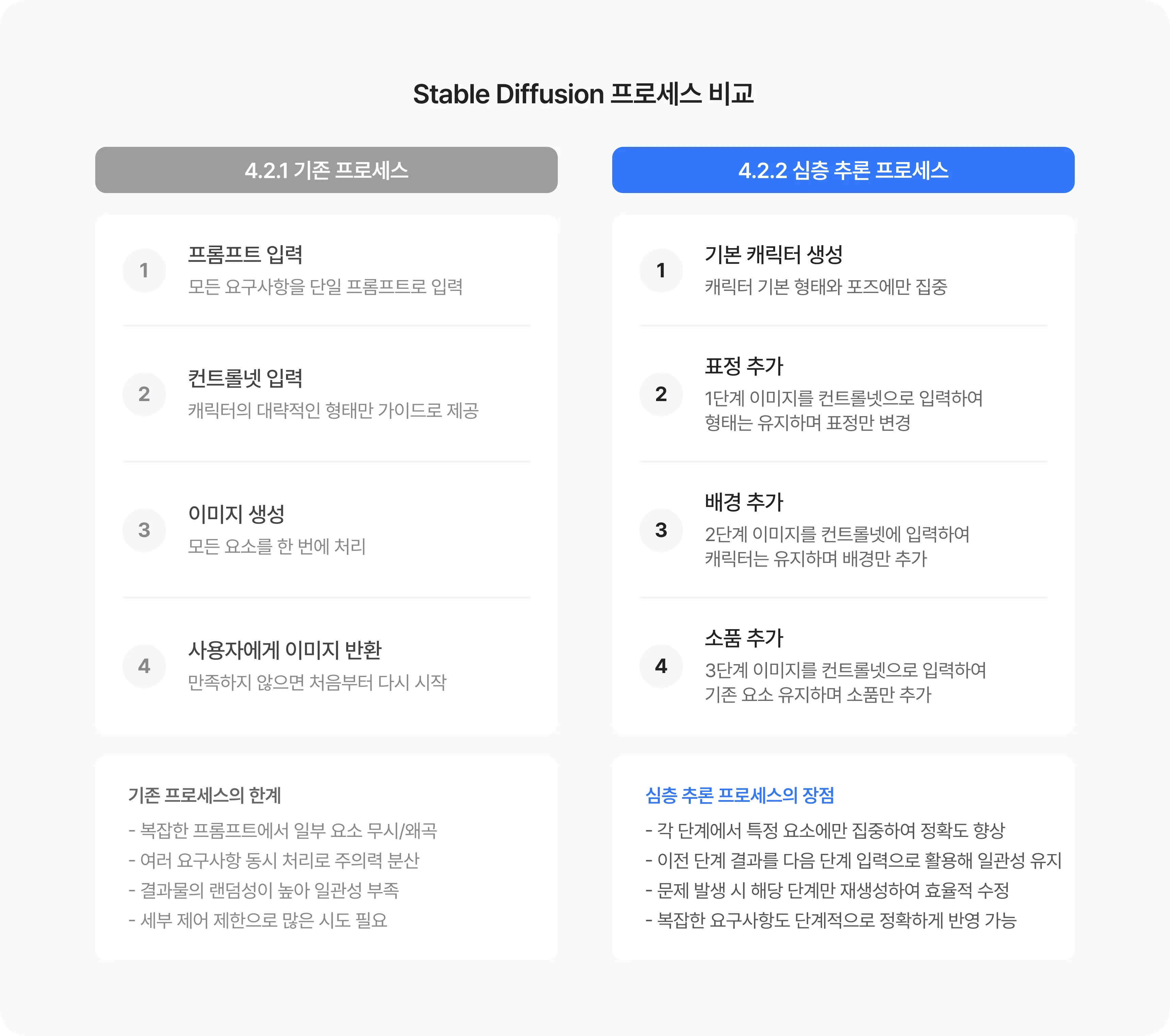 ControlNet을 통해 상당한 품질 개선을 이루었지만, 저희의 목표는 단순히 '그럴듯한' 이미지를 넘어, 더욱 창의적이고 자유로운 연출이 가능하며, 사용자의 복잡한 요구사항까지 완벽하게 반영하는 궁극의 이미지 생성 솔루션을 만드는 것이었습니다. "어떻게 하면 AI가 단순히 이미지를 복제하는 것을 넘어, 사용자의 의도를 더 깊이 이해하고, 여러 요소를 조화롭게 통합하여 상상 속 장면을 완벽하게 구현할 수 있을까?" 이 고민이 바로 'Stable Diffusion 심층 추론' 연구의 시발점이 되었습니다.